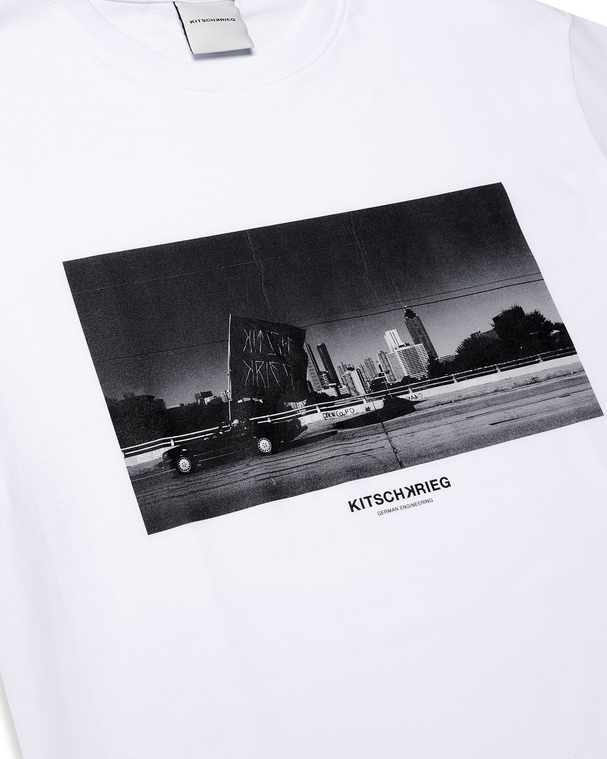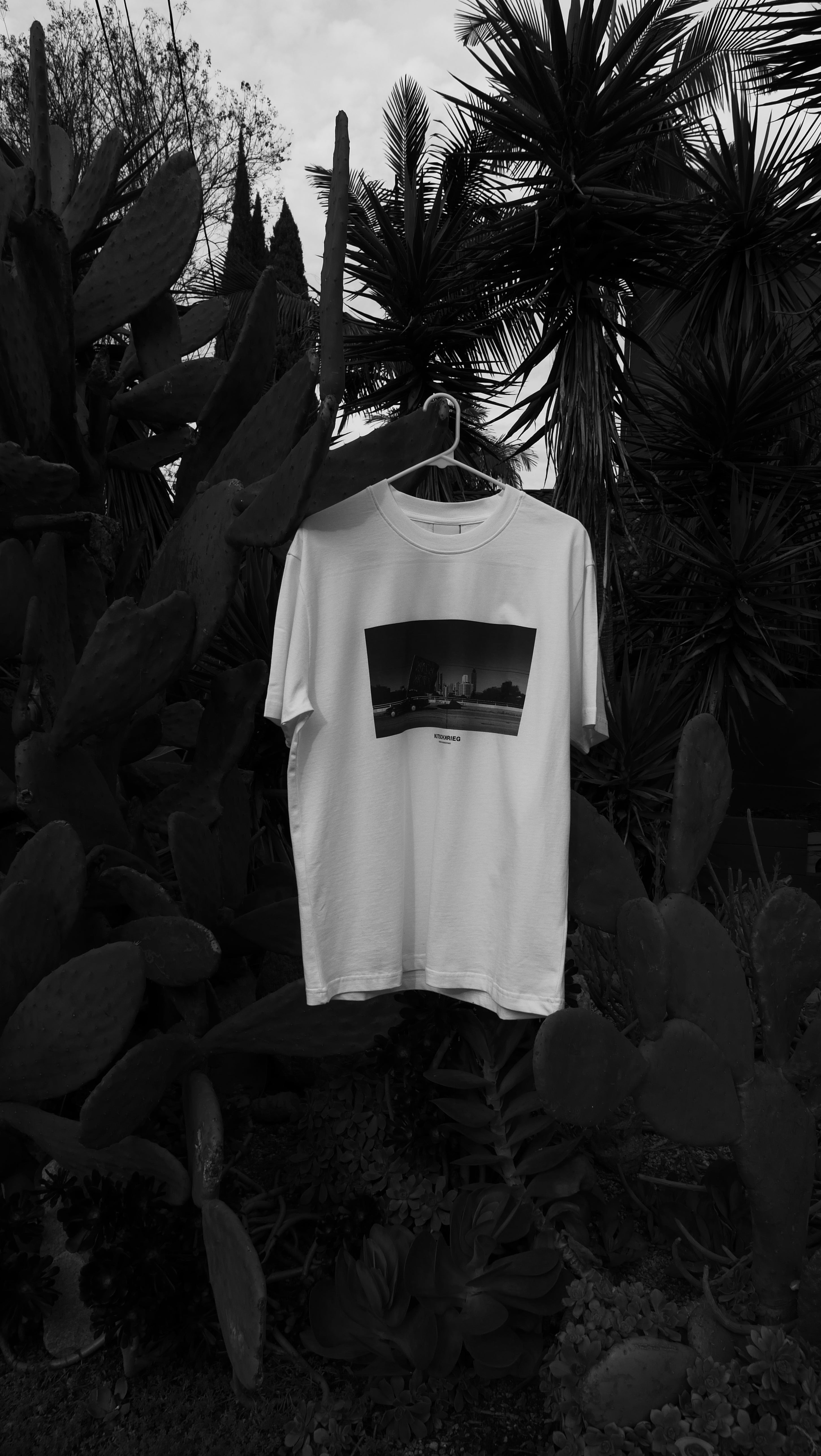100% Cotton. 230 gsm fabric. Color: White. Heavy. 1x1 ribbed neck. Screen Print. Machine wash.