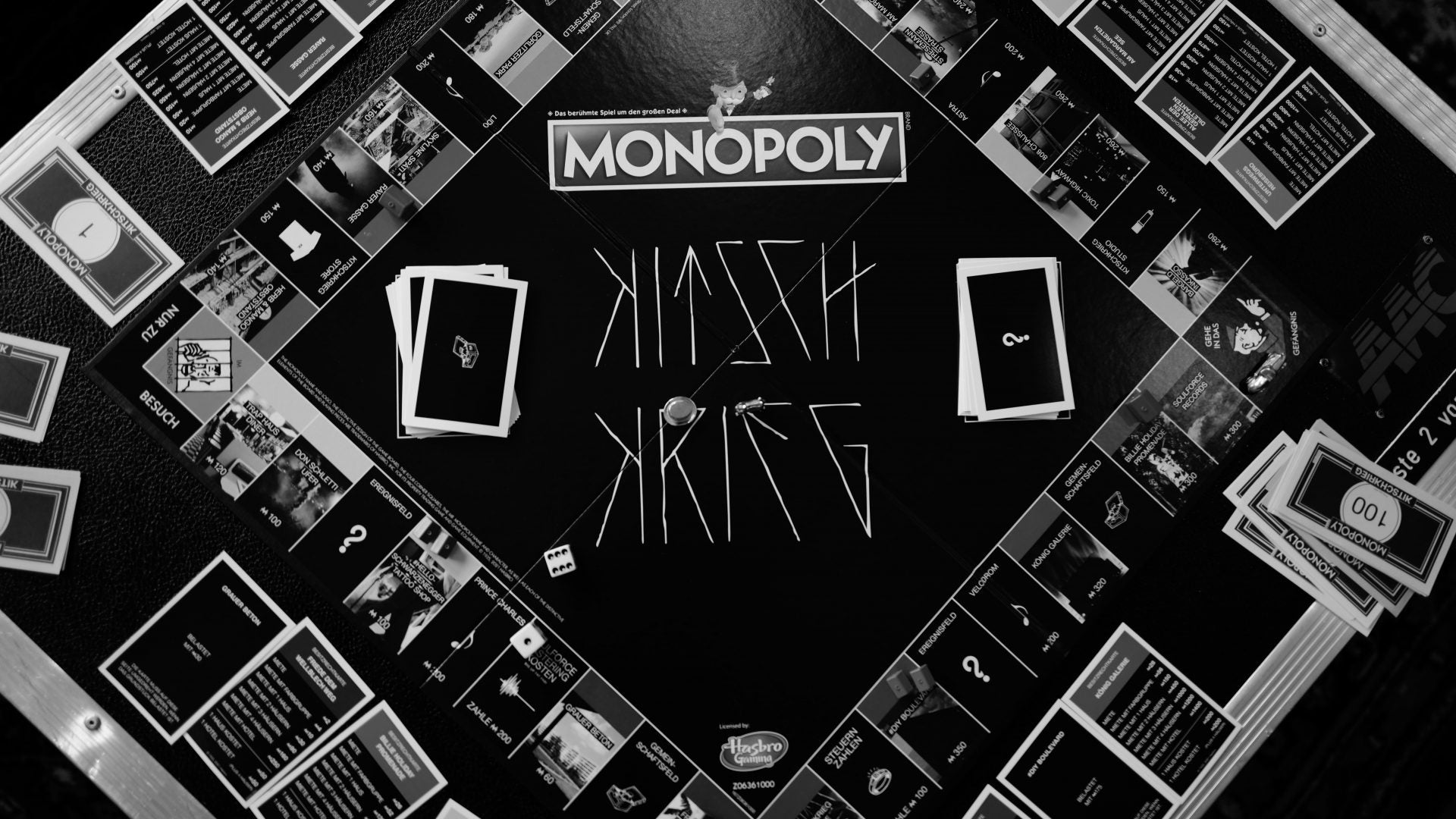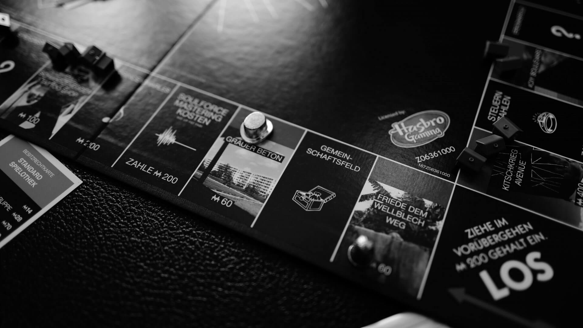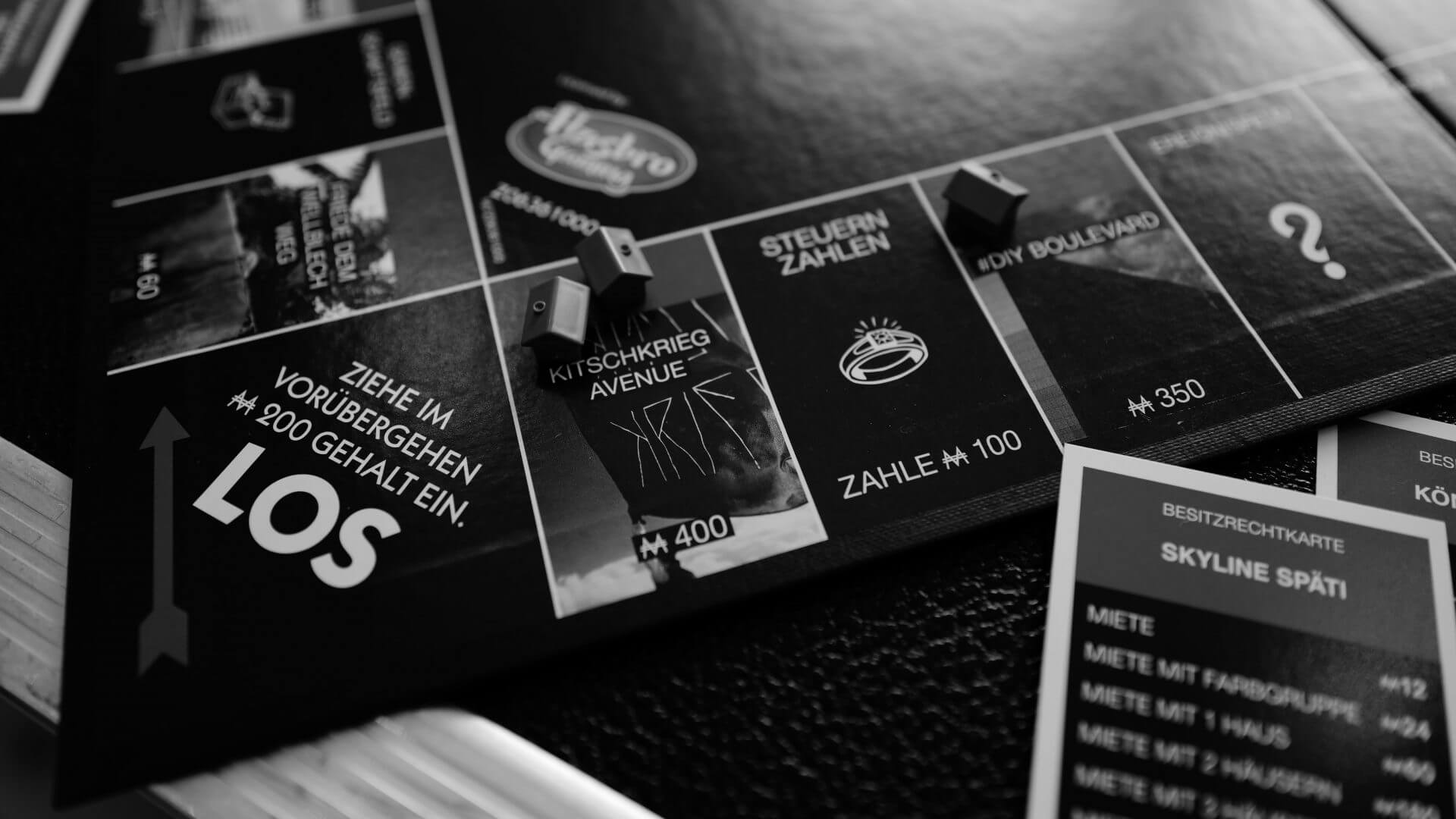 Come to the "Skyline Späti", get your vitamins at the "Herb & Mango" fruit stand, check if you have enough money to buy the "KITSCHKRIEG Avenue" or the "#DIY Boulevard" or just hang out in the Stresemannstrasse. Of course, you can also end up in jail with us because there is simply "too much crime" or the event card simply tells you: "Dioz Mioz" and you get 50 KK Dollars. Roll a double, draw a community chest card and let Schletti book you for the Splash or follow the instructions and let #Helloschwarzenegger tattoo a KITSCHKRIEG logo on your arm.