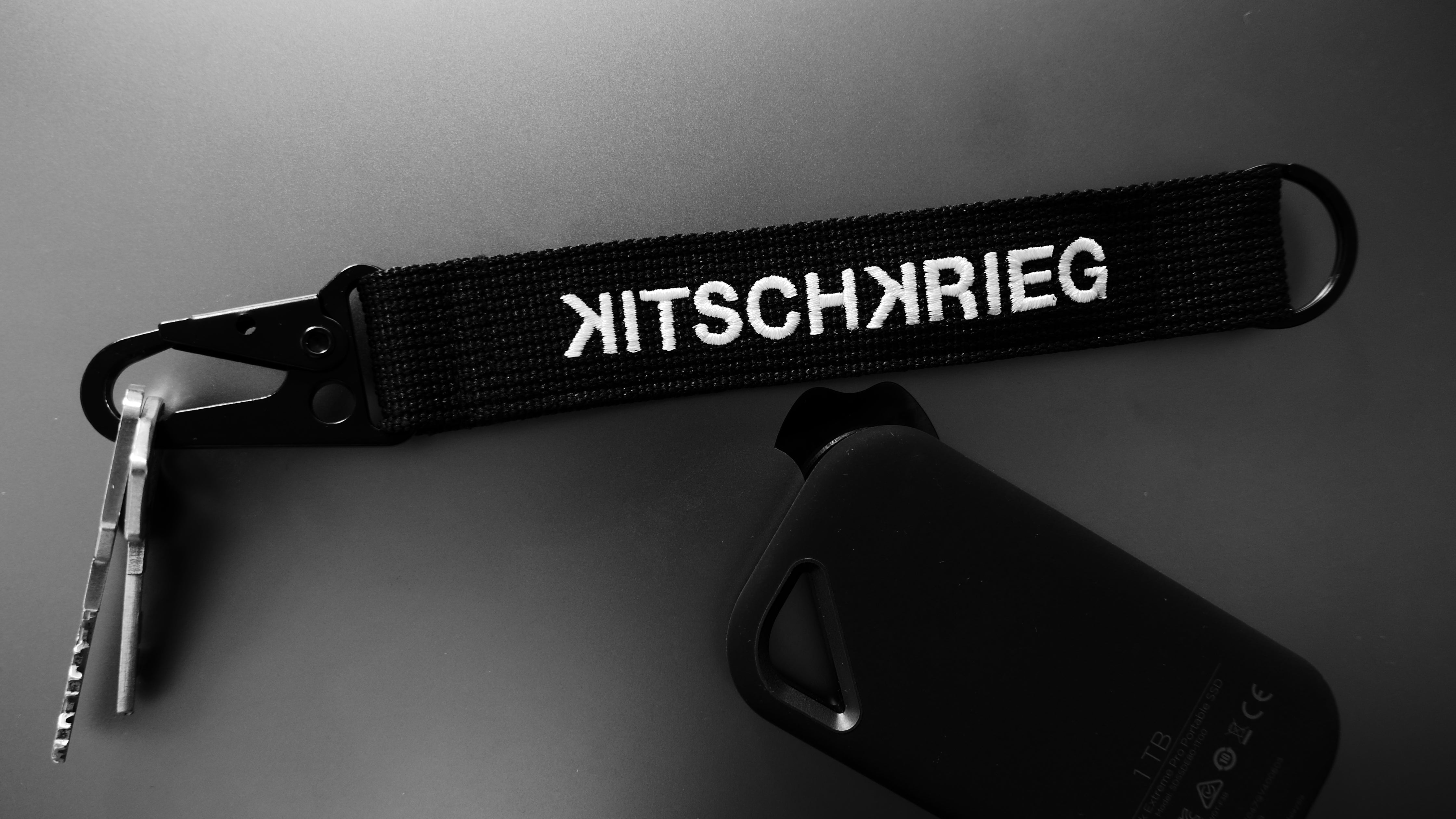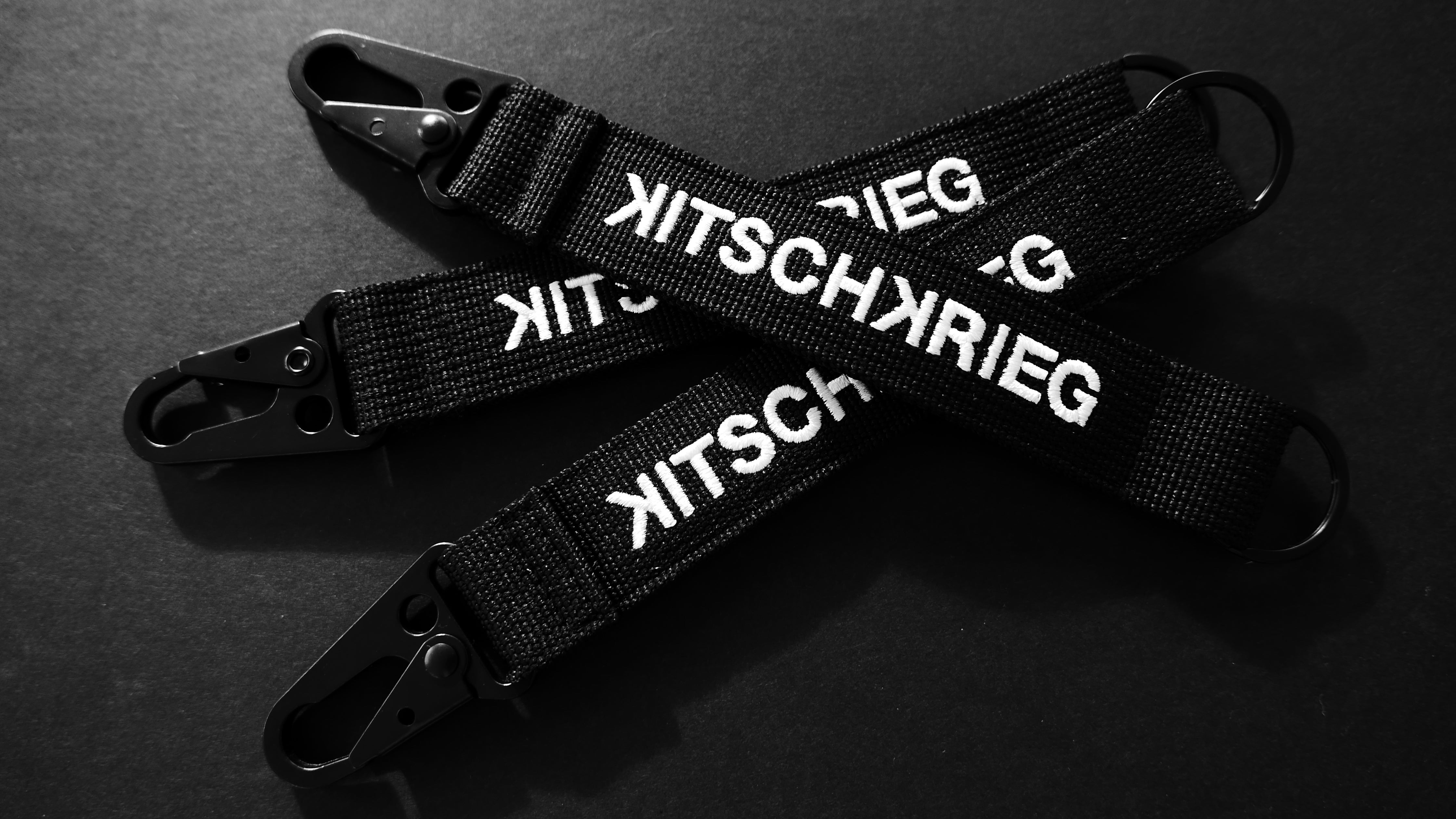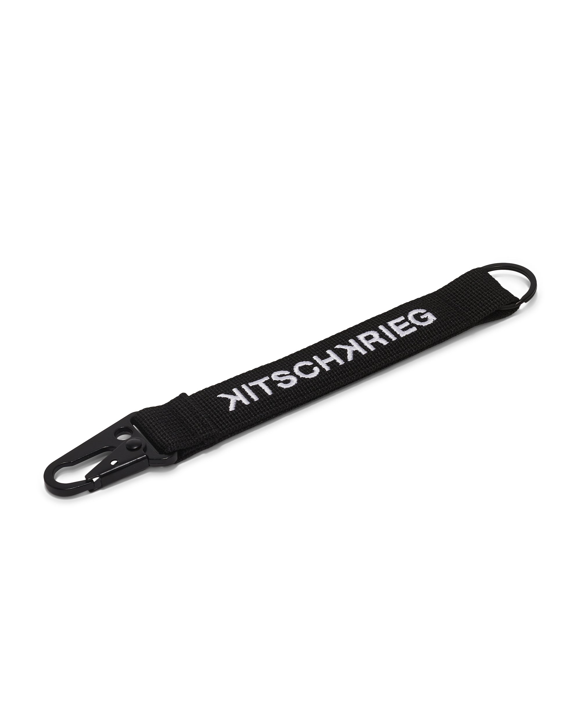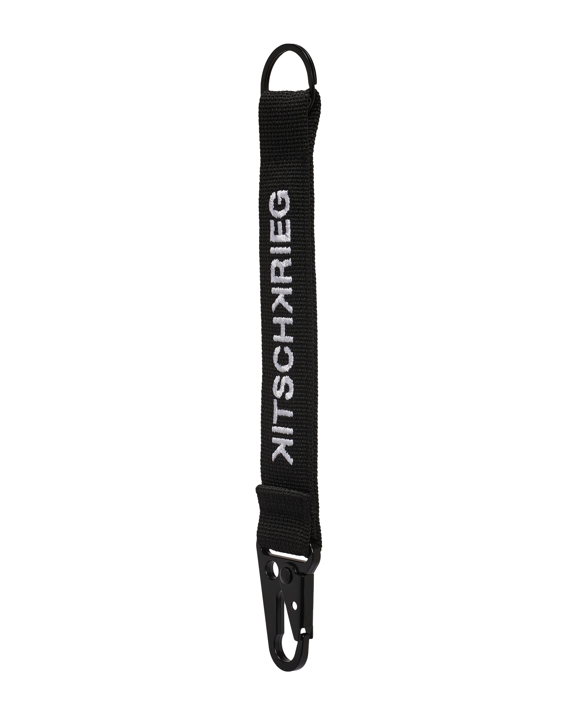 100% Polyester and Metal. Color: Black/White. Dimensions: Length 22,5 cm x Width 3 cm. Embroidery. Carabiner and D-Ring. With carabiner.