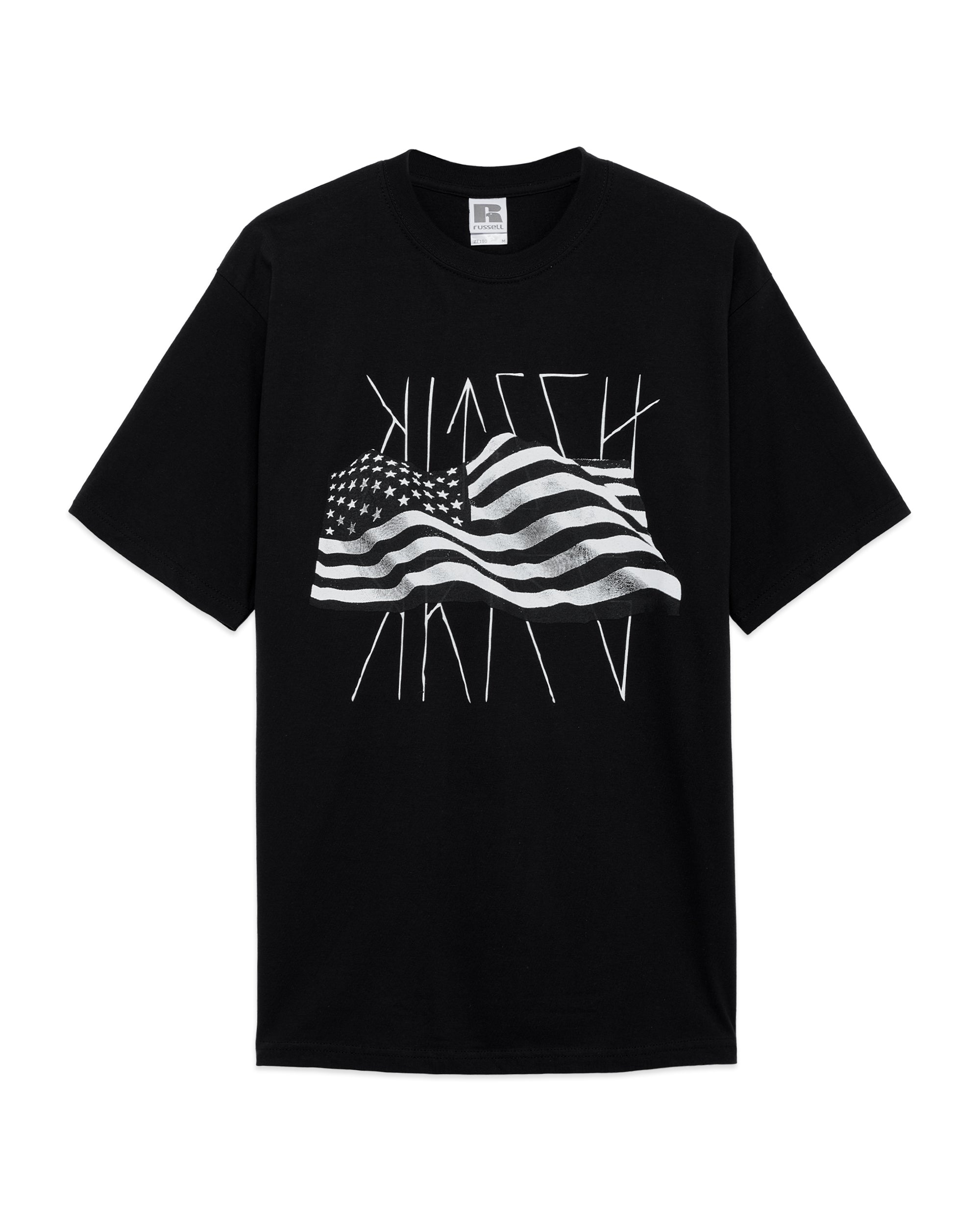 100 % Cotton. 180 gsm fabric. Russell T-Shirt. Color: Black. Screen Print. Machine wash.